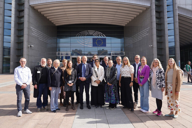 Den midtjyske delegation foran Europa-Parlamentet i Bruxelles sammen med oplægsholdere og deltagere fra rundbordsarrangementet